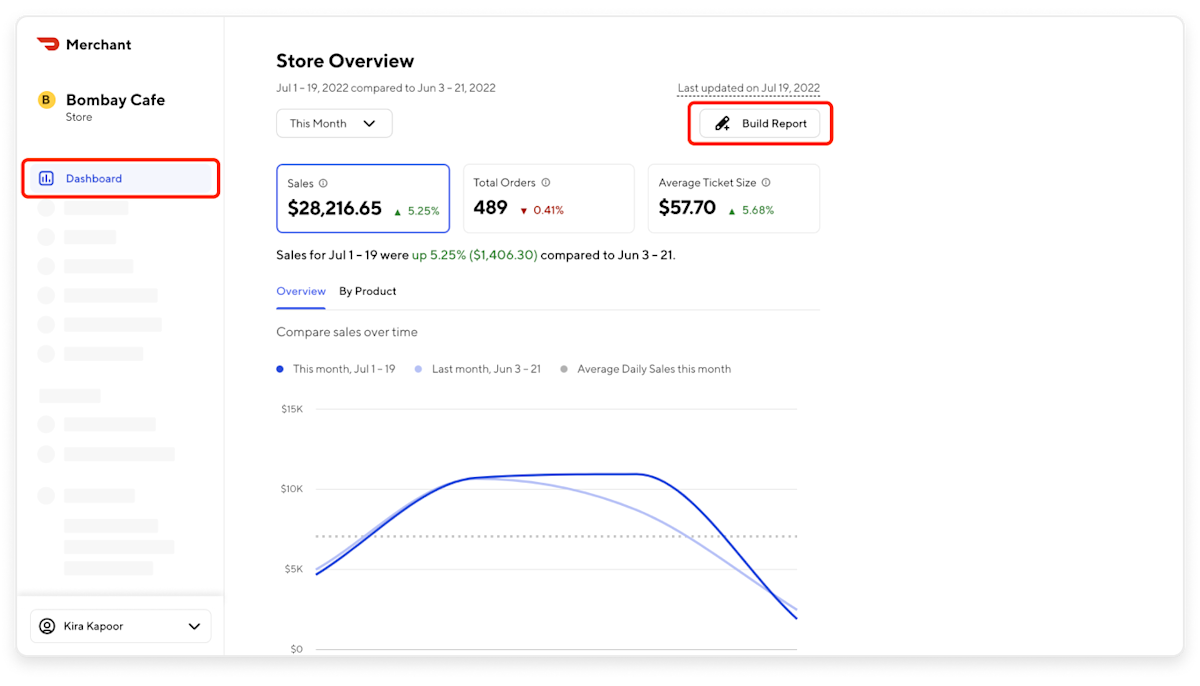 Sales Report: Marketplace and Storefront sales, average ticket size, total orders, comparison across products such as DashPass, Marketplace and Pickup; it can also help you analyze sales between new and returning customers.