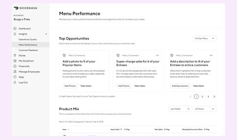 DoorDash partners can use the Menu Performance tab in the Insights Hub to access product mix reporting, so you can find out which items on your menu are most popular and which are bringing in the most sales. Bonus tip: You can then calculate the item's food cost percentage based on your data on inventory costs to see if there's room for improvement.