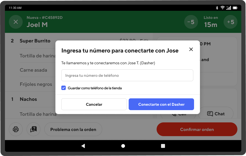 4. Te llamaremos y te conectaremos con el cliente o el Dasher. Tu número de teléfono estará oculto y en el identificador de llamadas dirá “DoorDash”.