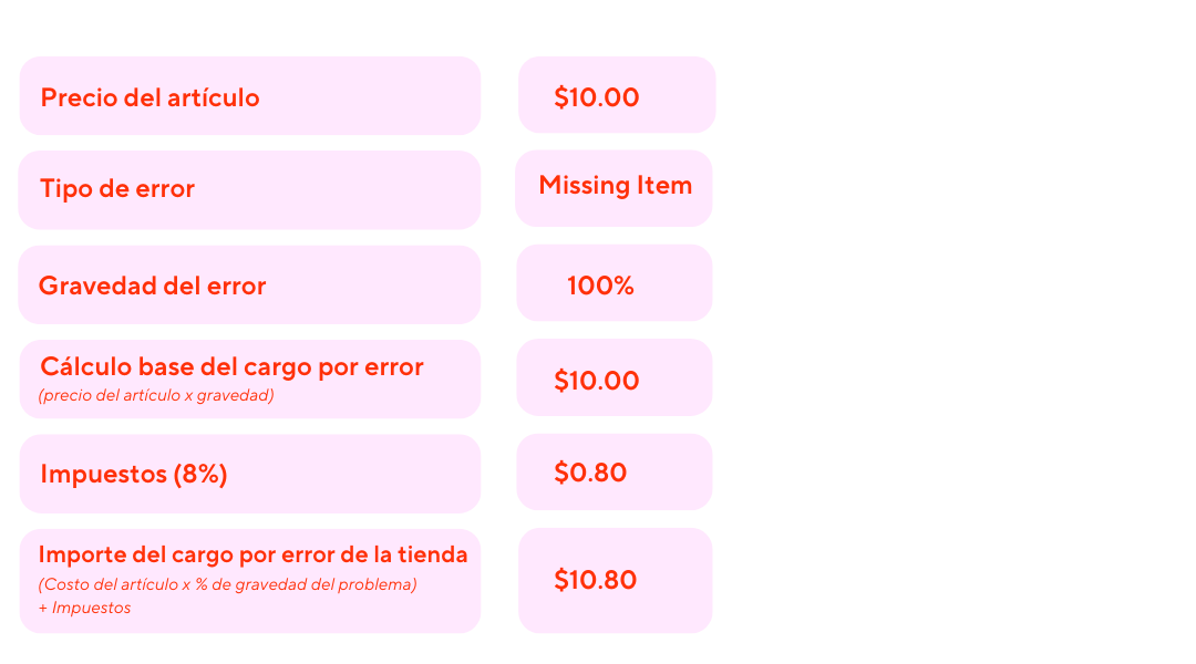 Los cargos por error se debitan directamente de los pagos de las tiendas y, en función de la gravedad del problema, se puede cobrar al restaurante entre el 25% y el 100% del precio del artículo aplicable más impuestos. Si se entregara una orden incorrecta al Dasher, se cobraría al restaurante el 100% del subtotal de la orden + impuestos, neto de comisiones. El siguiente ejemplo muestra el cálculo del cargo por error para un artículo del menú de 10$ que el cliente ha señalado como «faltante» en el pedido (100% del precio del artículo + impuestos reembolsados al cliente).